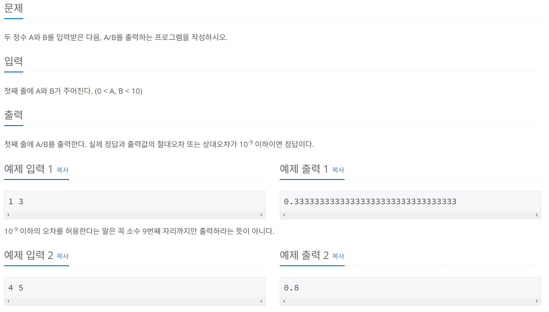 정수 A,B를 입력받고 예제 출력과 같이 소수점을 이용하여 결과값을 출력해야한다. 이때 출력의 조건으로 "실제 정답과 출력값의 절대오차 또는 상대오차가 10^-9 이하이면 정답이다."라는 구절을 확인할 수 있다. 즉슨, 실제 정답과 출력값은 10^-8 까지 동일해야한다는 사실을 파악할 수 있다.
