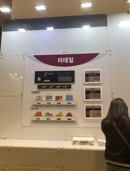이 제품을 보고 나도 이 생각한 적 있는데! 싶었다 ㅎㅎ 이건 이 사업에서 주로 운영하는 시스템(스마트 오피스)에서 사용하는 전자 스마트 라벨을 리테일에 착용한 결과물인데, *ERP시스템 기반 데이터를 표시하는 ESL이다. ERP시스템이라 함은, 전사적 자원 관리시스템으로, 경영 활동 프로세스들을 통합적으로 연계해 관리해 주며, 기업에서 발생하는 정보들을 서로 공유하고 새로운 정보의 생성과 빠른 의사결정을 도와준다. 위의 경우에는 마트 진열된 상품에 붙이는 상품태그를 전자 스마트 라벨로 대체한 것이다. 실제로 이마트24 같은 편의점에 도입하여 사용되고 있는 시스템이라는 점에서 프로토타입이 많았던 다른 부스와는 차별점을 두고 있었다. 다음에 한번 유심히 진열대를 살펴봐야지
